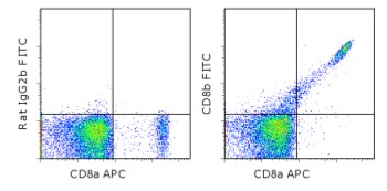 Description: The eBioH35-17.2 monoclonal antibody reacts with the mouse CD8 beta molecule. The CD8 beta chain associates with the CD8 alpha chain to form the CD8 alpha/beta heterodimer expressed on the surface of a majority of thymocytes, and on peripheral cytotoxic alpha beta TCR T cells. CD8 binds to MHC class I and plays a role in T cell development and activation of mature T cells.