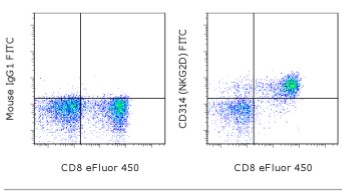 Description: The 1D11 monoclonal antibody reacts with the human NKG2D, a 42 kDa lectin-like molecule expressed by NK cells, gamma delta T cells, some CD4+ and CD8+ T cells. Human NKG2D forms complexes with DAP10, a membrane adaptor protein, and has the ability to costimulate multiple NK activation receptors. The counter-receptor for human NKG2D has been identified as MICA/MICB expressed on epithelial tumors from lung, breast, kidney, ovary, prostate and colon carcinoma. 5C6 and 1D11 block binding of soluble MICA to gamma delta TCR T cell clones and inhibit lysis by these cells. 5C6 and 1D11 induced NKG2D function of redirected lysis of FcReceptor bearing P815 cells.
