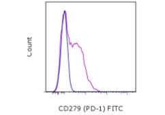 Description: The RMP1-30 antibody reacts with mouse PD-1 (programmed death-1), a 55 kDa member of the Ig superfamily. PD-1 contains the immunoreceptor tyrosine-based inhibitory motif (ITIM) and plays a key role in peripheral tolerance and autoimmune disease in mice. PD-1 is expressed mainly on activated T and B lymphocytes. Two novel B7 Family members have been identified as PD-1 ligands, PD-L1 (B7-H1) and PD-L2 (B7-DC). Evidence reported to date suggests overlapping functions for these ligands and their constitutive expression on some normal tissues and upregulation on activated antigen-presenting cells. RMP1–30 does not block the binding of either B7-H1-Ig or B7-DC-Ig to PD-1 transfectants.