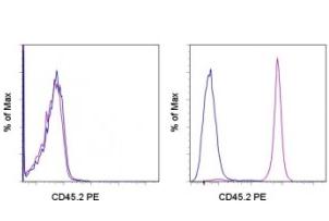 Description: The 104 monoclonal antibody reacts with the mouse CD45 molecule, the leukocyte common antigen (LCA) in CD45.2-expressing mouse strains. The strains that express CD45.2 include the most commonly used mouse strains C57BL/6, BALB/c, C58, DBA/1, DBA/2, C3H/He, CBA, 129, A and AKR. CD45.2 is expressed by all leukocytes in these strains.