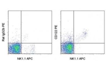 Description: The TM-b1 monoclonal antibody reacts with mouse CD122, the 90-110 kDa interleukin-2 receptor beta chain (IL-2R beta). CD122 is expressed by NK cells and some T cells in the periphery, and is upregulated by activation. CD122 associates with CD25 and CD132 (common gamma chain) to form the high affinity IL-2 receptor. High affinity binding of IL-2 to the IL-2 receptor is inhibited by the TM-b1 antibody.