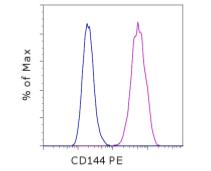 Description: The 16B1 antibody reacts with human CD144, also known as VE-cadherin and cadherin-5. The cadherin family of receptors, which are calcium-dependent adhesion molecules, is known to be involved in homophilic cell interactions. VE-cadherin, which is 140 kDa, is localized at the intercellular boundaries of endothelial cells in blood and lymphatic vessels in several tissues. It is thought to play a role in vascular permeability and remodeling.