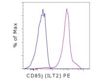 Description: The monoclonal antibody HP-F1 recognizes CD85j, also known as ILT2, LILRB1, and LIR1. CD85j is a member of the ILT (immunoglobulin-like transcript)/LIR (leukocyte Ig-like receptor)/MIR (monocyte Ig-like receptor) family. CD85j is a single transmembrane glycoprotein with a long cytoplasmic domain containing 4 ITIMs which signal through interactions with SHP-1. Expression is found on myeloid cells (monocytes and dendritic cells) and some lymphoid cells including, subsets of NK, T and B cells. Expression has been correlated with leukemias such as ALL and CLL. Expression on CD8+ cells correlates with effector cell function and plays an important role in viral infections, including HIV, Ebstein Barr and CMV. The ligands for CD85j are MHC Class I molecules such as HLA-G, A, F, B27, E and F.