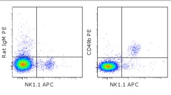 Description: The DX5 monoclonal antibody reacts with CD49b, an antigen expressed on a majority of mouse natural killer cells and a subset of T cells. DX5 reacts with all strains of mouse tested including the most commonly used strains, BALB/c, C57BL/6, C3H, CBA, DBA, AKR, SJL and 129. Simultaneous staining of C57BL/6 spleen cells with anti-NK1.1 mAb (PK136) and DX5 reveals coexpression of both markers by a majority of cells as well as presence of small populations of DX5+PK136- and DX5-PK136+ cells.