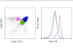 Description: This TXRX10 monoclonal antibody reacts with human and mouse TOX, which is also known as Thymocyte selection-associated HMG box protein. This DNA-binding nuclear factor is expressed in thymocytes, T lymphocytes, NK cells, and lymphoid tissue-inducer (LTi) cells. TOX expression in thymocytes is upregulated during beta-selection and positive selection. Studies using Tox knockout mice have demonstrated a critical role for TOX in CD4+ T cell development as a regulator of the CD4loCD8lo to CD4+CD8lo transition. Moreover, TOX has been shown to be involved in the development of NK and LTi cells. While its regulation remains unclear, TOX expression has been shown to be induced by calcineurin-mediated TCR signaling in thymocytes during positive selection.