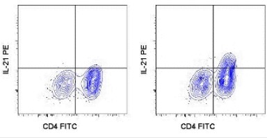 Description: This FFA21 monoclonal antibody reacts with mouse interleukin-21 (IL-21). IL-21 is a 17 kDa immunomodulatory cytokine produced mainly by NKT, T helper (Th) 17 and T follicular helper (TFH) cells. In TFH cells, IL-21 expression leads to autocrine signaling through the IL-21 receptor (IL-21R) and STAT3, which leads to additional transcriptional activation by Bcl6. As with IFN gamma for Th1, IL-4 for Th2 and IL-17A for Th17, IL-21 is critical for TFH cell effector function. This cytokine plays a role in T cell-dependent B cell differentiation into plasma cells and memory cells, stimulation of IgG production and induction of apoptotic signaling in naïve B cells.
