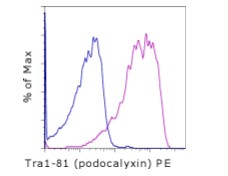Description: The TRA-1-81 antibody recognizes a protein expressed on undifferentiated human embryonic stem cells (ES), embyronal carcinoma cells (EC), and embryonic germ cells (EG). Like other stem cell specific markers, the epitope recognized by the TRA-1-81 antibody is lost upon cell differentiation. The TRA-1-81 epitope is resistant to neuraminidase digestion, unlike the epitope recognized by the related TRA-1-60 antibody. The TRA-1-81 antibody is known to specifically recognize a carbohydrate epitope on a keratan sulfated glycoprotein recently identified as podocalyxin, a member of the CD34-related family of sialomucins. Podocalyxin is a transmembrane glycoprotein originally identified on epithelial glomerular cells known as podocytes, and the protein has also been implicated in the development of aggressiveness in a variety of cancers, including breast and prostate cancer.