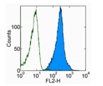 Description: CD230 (prion protein; PrPC) is a 35 kD glycoprotein, attached to the cell surface via a GPI-anchor. While the function of CD230 is unclear, prion protein has been the focus of research based on its involvement in transmissible spongiform encephalopathies (TSE), including Creutzfeld-Jakob disease in humans. CD230 undergoes a conformational change in which the cellular PrPC form is converted to the scrapie PrPSc form. This conversion is essential for the infectiousness of prion-based diseases. CD230 is predominantly expressed on the surface of lymphocytes and monocytes, with weak expression on granulocytes and erythrocytes. In platelets, CD230 is expressed primarily intracellularly, and is upregulated to the surface upon activation.