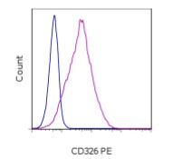 Description: EpCAM (Epithelial cell adhesion molecule, CD326, KSA, TROP1) is a 40 kD cell-surface adhesion molecule participating in homophilic, calcium-independent cell-cell interactions. EpCAM is a type-I transmembrane protein, and is expressed primarily on the basolateral surface of most epithelia. Although normal epithelia express low levels of EpCAM, increased expression has been correlated with increased proliferation and progression to a mesenchymal phenotype. EpCAM has also been used as a diagnostic marker on circulating metastatic carcinoma cells, while cancer cells of non-epithelial origin do not express EpCAM.