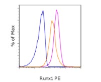 Description: This RXDMC monoclonal antibody reacts with human and mouse Runx1, which is also known as AML1. This 50-kDa transcription factor is expressed in hematopoietic cells such as myeloid, T, and B cells, but not erythroid cells. Furthermore, Runx1 can be detected in nearly all non-hematopoietic tissues except the brain and heart. Runx1 is involved in several stages of T cell development, including the CD4-CD8- double negative (DN) to CD4+CD8+ double positive (DP) transition and commitment to the CD4 lineage. In addition to its role in thymocyte development, Runx1 has also been implicated in Th2 differentiation and immune homeostasis via direct interaction with Foxp3 in CD4+CD25+ regulatory T cells. Runx1 also affects Th2 differentiation by negatively regulating Gata-3 expression. Finally, the AML1 gene, which encodes Runx1, is a frequent target of translocations in acute myeloid leukemia.