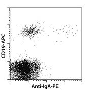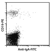 The Anti-IgA antibody clone IS11-8E10 detects both subclasses of human IgA. IgA is present either as monomer or in a secreted form as a multimer of 2-4 molecules, connected by the J-chain and the so-called secretory component. Secreted IgA is transported across epithelial cells and secreted into the lumen of the respiratory and gastrointestinal tract.