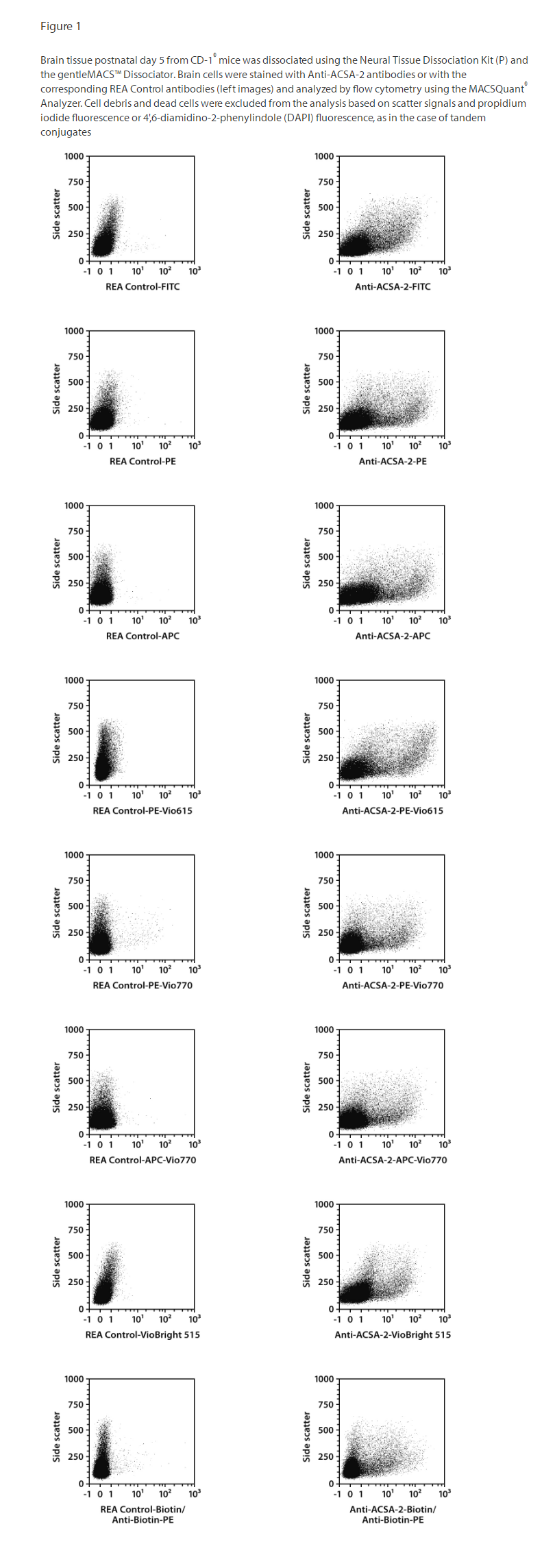 Clone REA969 recognizes the mouse ACSA-2 antigen (ACSA-2: astrocyte cell surface antigen-2), which has been developed for the detection of astrocytes from cell suspensions of mouse neural tissue based on the expression of the ACSA-2 protein. The ACSA-2 antigen is specifically expressed on GLAST (ACSA-1) positive astrocytes and is therefore a specific marker of astrocytes in the developing and neonatal mouse central nervous system (CNS). The percentage of ACSA-2 positive astrocytes differs according to the mouse age and the brain region.