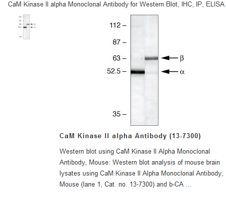Ca2+/Calmodulin-Dependent Protein Kinase II (CaM Kinase II) is a multi-functional calcium and calmodulin-dependent protein kinase that mediates cellular response to a wide variety of intercellular signals (Kennedy, 1998; Schulman and Hanson, 1993). CaM Kinase II has been shown to regulate diverse cellular functions including synaptic plasticity, neurotransmitter synthesis and release, gene expression, ion channel function, carbohydrate metabolism, cytoskeletal function, and Ca2+-homeostasis (Gleason et al., 2003; Soderling, 2000; Hudmon and Schulman, 2002). Phosphorylation of Thr286 on the kinase produces an autonomously active form of CaM Kinase II (Meng et al., 2003; Picciotto et al., 1993). Autophosphorylation of Thr305 inhibits the activity CaM Kinase II. Phosphorylation at this site appears to reduce the association of CaM Kinase II with the PSD andreduces LTP and learning (Elgersma et al., 2002