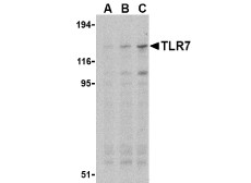 Description: The polyclonal antibody reacts with human and mouse TLR7 and was generated using 14 amino acid residues near the middle of mouse TLR7. To date, at least twelve members of the Toll family have been identified. This family of type I transmembrane proteins is characterized by an extracellular domain with leucine-rich repeats and a cytoplasmic domain with homology to the type I IL-1 receptor. In the innate immunity system, TLRs recognize molecular patterns associated with microbial pathogens and induce antimicrobial immune responses. TLR7, similar to TLR3, 8, and 9, is localized to endosomal/lysosomal compartments and is reported to respond to single-stranded RNA and some anti-viral compounds. Immunoblotting with this antibody gives a MW of ~120 kDa in Daudi cells.
