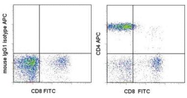 Description: The SK3 monoclonal antibody reacts with human CD4, a 59-kDa cell surface receptor expressed by a majority of thymocytes, a subpopulation of mature T helper cells, and, in low levels, monocytes. CD4 is a receptor for the human immunodeficiency virus (HIV). SK3 blocks HIV binding and mixed lymphocyte reaction. The SK3 and RPA-T4 monoclonal antibodies do not cross-block binding, suggesting recognition of distinct epitopes.