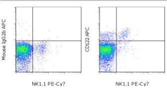 Description: The TM-b1 monoclonal antibody reacts with mouse CD122, the 90-110 kDa interleukin-2 receptor beta chain (IL-2R beta). CD122 is expressed by NK cells and some T cells in the periphery, and is upregulated by activation. CD122 associates with CD25 and CD132 (common gamma chain) to form the high affinity IL-2 receptor. High affinity binding of IL-2 to the IL-2 receptor is inhibited by the TM-b1 antibody.