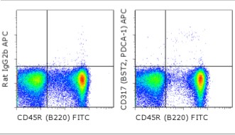 Description: The eBio927 monoclonal antibody reacts with PDCA-1 (BST2, CD317), a specific marker of plasmacytoid dendritic cells (pDC), also known as type I IFN-producing cells (IPC) in the naïve mouse. Mouse IPCs are typically CD11c+, CD11b-, B220+, Ly-6C+, and CD62L+. PDCA-1 is predominantly expressed by IPCs in the naïve mouse which represents a very minor population (<0.5%) of splenocytes. It is upregulated on numerous cell types following stimulation which triggers an IFN response. PDCA-1 cycles between cell surface and intracellular compartments and may function to regulate trafficking of secreted cytokines. PDCA-1 (BST2) is the protein recognized by antibody 120G8.