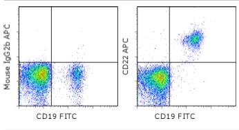 Description: The S-HCl-1 monoclonal antibody recognizes human CD22 (Siglec-2), which is a member of the siglec subgroup of the Ig superfamily. CD22 is a type I transmembrane glycoprotein composed of two polypeptide chains, CD22a and CD22ß, of 130 and 140 kDa respectively, produced by alternative splicing of the CD22 gene. CD22 is expressed at high levels on mature B cells and B cell lymphomas. The extracellular portion of CD22 contains seven Ig-like domains, some of which are capable of binding ligands with sialic acid moieties expressed on epithelial, endothelial, B and T cells. The intracellular portion of CD22 contains 6 tyrosine residues contained within immunotyrosine-based inhibitory motifs (ITIM) and immunotyrosine-based activation-like motifs, which are phosphorylated upon B-cell receptor engagement, which enables CD22 to participate in the positive and negative regulation of B-cell receptor signaling.