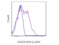 Description: The J43 monoclonal antibody reacts with mouse PD-1 (programmed death-1), a 55 kDa member of the Ig superfamily. PD-1 contains the immunoreceptor tyrosine-based inhibitory motif (ITIM) and plays a key role in peripheral tolerance and autoimmune disease in mice. PD-1 is expressed mainly on activated T and B lymphocytes. Two novel B7 Family members have been identified as PD-1 ligands, PD-L1 (B7-H1) and PD-L2 (B7-DC). Evidence reported to date suggests overlapping functions for these ligands and their constitutive expression on some normal tissues and upregulation on activated antigen-presenting cells. It is reported that J43 inhibits the binding of mouse PD-L1-Ig and mouse PD-L2-Ig to PD-1/BHK transfected cells. When administrated in vivo, both intact and Fab of J43 are reported to enhance contact hypersensitivity and exacerbate acute GVHD similar to transfer of PD-1-deficient cells. Injection of J43 also exacerbates EAE and NOD diabetes as do specific antibodies to mouse PD-L1 and PD-L2.