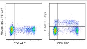 Description: The eBio4B10 monoclonal antibody reacts with mouse and human T-bet. T-bet is a Th1-specific T-box transcription factor critical to the development of the Th1 CD4+ T cell lineage. This is known based on the observations that T-Bet deficient mice have impaired Th1 cell development, and that ectopic expression of T-Bet results in development skewed to the Th1 lineage. T-Bet expression is induced by the Th1 cytokine IFN gamma, and T-Bet also regulates the expression of IFN gamma, likely, at least in part, through the modification of DNA accessibility and histone remodeling. In addition to IFN gamma, T-Bet is also known to regulate the expression of IL-12R beta and IL-2. Moreover, T-Bet plays a role in class-switch recombination in B-cells.