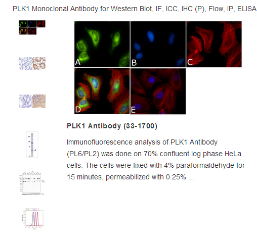 33-1700 contains a cocktail of monoclonal mouse PLK1 containing clone PL6, isotype IgG1, kappa and clone PY20, isotype IgG2b.