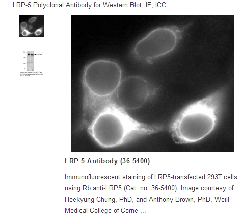 Synthetic peptide derived from the C-terminal region of the human LRP5 protein. This intracellular region is identical to the corresponding mouse and rat LRP5 amino acid sequences.