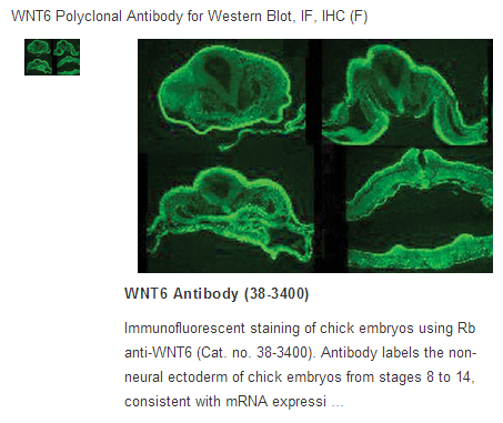 The WNT gene family consists of structurally related genes which encode secreted signaling proteins. These proteins have been implicated in oncogenesis and in several developmental processes, including regulation of cell fate and patterning during embryogenesis. This gene is a member of the WNT gene family. It is overexpressed in cervical cancer cell line and strongly coexpressed with another family member, WNT10A, in colorectal cancer cell line. The gene overexpression may play key roles in carcinogenesis. This gene and the WNT10A gene are clustered in the chromosome 2q35 region. The protein encoded by this gene is 97% identical to the mouse Wnt6 protein at the amino acid level.