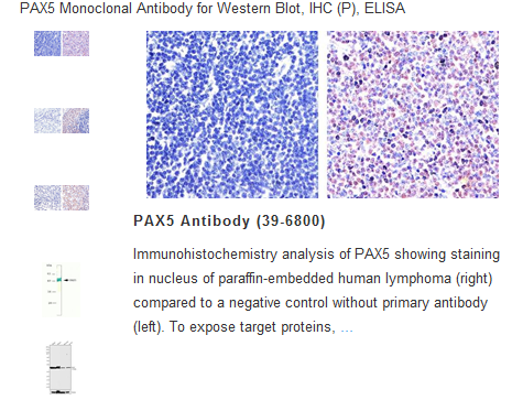 PAX-5 is a B-cell-specific activator protein (BSAP). In the early stages of B cell developmemt, PAX-5 influences the expression of several B-cell-specific genes, such as CD19 and CD20. PAX-5 is expressed primarily in pro-, pre-, and mature B cells, but not in plasma cells. PAX-5 is expressed in most B-cell malignancies (pre-B and mature B cell lymphomas/leukemias). Over 90% of cases are positive for PAX-5 in Hodgkin's lymphoma, lymphoplasmacytic lymphoma, Merkel cell and small cell carcinoma. T-cell lymphomas, myeloma/plasmacytoma and carcinoid tumors are negative for PAX-5.