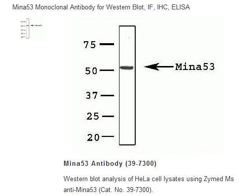 MINA is nuclear localized, myc-inducible protein that is thought to play a role in mammalian cell proliferation. Treatment of cancer cells lines such as the colon cancer cell line SW680 with siRNA against MINA inhibits cell growth, demonstrating that MINA may be a potential therapeutic target. MINA regulates several genes related to cell adhesion and metabolism that have also been shown to be regulated by c-Myc, but also regulates other genes whose expression are not modulated by c-Myc such as EGFR, IL-6 and HGF. MINA has also been found to act as a repressor to IL-4 expression in T cells, indicating that it may also play a role in T cell differentiation and genetic variation in T helper type 2 bias.