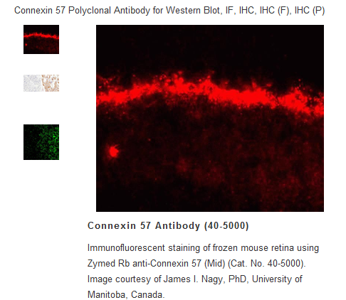 40-5000 was used in immunofluorescence analysis of Connexin57 (Cx57) on sections of adult mouse retina.