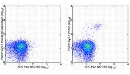 Description: The PK136 monoclonal antibody reacts with mouse NK1.1, an antigen expressed by natural killer cells and a subset of T cells in the NK1.1 mouse strains including C57BL and NZB. Several commonly used laboratory mouse strains such as BALB/c, SJL, AKR, CBA, C3H and A do not express the NK1.1 antigen. For detection of NK cells in these strains the monoclonal antibody DX5 (Cat. No. 14-5971) should be used. Simultaneous staining of C57BL/6 spleen cells with PK136 and DX5 reveals coexpression of both markers by a majority of cells as well as presence of small populations of DX5+PK136- and DX5-PK136+ cells.