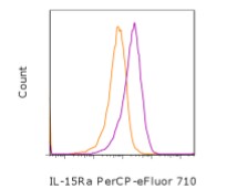 Our testing suggests that there may be strain differences in expression and staining of the Mouse IL-15 Receptor alpha. This DNT15Ra antibody has been tested on cells from C57Bl/6 mice. Staining has also been observed with this antibody after pre-incubation of NK cells with exogenous Mouse IL-15/IL-15R Complex, suggesting that DNT15Ra will recognize both Mouse IL-15 Receptor alpha and the Mouse IL-15/IL-15R Complex.