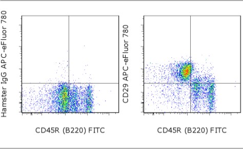 Description: The eBioHMb1-1 monoclonal antibody reacts with mouse and rat CD29 (integrin beta 1), a 110-120 kDa member of the beta integrin family expressed by leukocytes, endothelial, smooth muscle and epithelial cells. CD29 binds non-covalently with the alpha integrins CD49a-f to form the VLA-1 through VLA-6 complexes, as well as with CD51. These alpha-beta integrin heterodimers are capable of mediating a variety of cellular responses including adhesion, trafficking, proliferaton and differentiation. All integrins which include CD29 bind to extracellular matrix proteins including collagen, laminin, fibronectin and vitronectin, whereas some CD29-containing integrins can also interact with cellular receptors such as VCAM-1 and MadCAM-1.