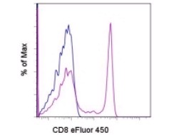 Description: The OKT8 monoclonal antibody reacts with the human CD8a molecule, an approximately 32-34 kDa cell surface receptor expressed either as a heterodimer with the CD8 β chain (CD8 αβ) or as a homodimer (CD8 αα). A majority of thymocytes and a subpopulation of mature T cells and NK cells express CD8a. CD8 binds to MHC class I and through its association with protein tyrosine kinase p56lck plays a role in T-cell development and activation of mature T cells. Preliminary testing indicates that OKT8 and two other mouse anti-human CD8 antibodies (clone RPA-T8, Cat. No.14-0088 and clone HIT8a, Cat. No.14-0089) do not compete with each other for binding to human peripheral blood leukocytes by flow cytometric analysis, suggesting that they do not bind to similar epitopes or block each other by steric hindrance.
