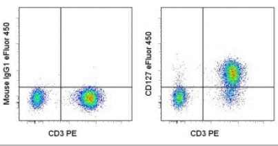 Description: The eBioRDR5 monoclonal antibody reacts with human CD127 (Interleukin-7 Receptor alpha). CD127 complexes with CD132, also known as the common gamma chain (gamma c), to form the multi-functional IL-7 receptor (IL-7R). CD127 is a type I glycoprotein with a molecular weight of 75-80 kDa and is expressed by immature B cells through the early pre-B stage, by thymocytes during several stages of their development, and on most mature T cells, with transient down-regulation upon activation. Binding of IL-7 results in signal transduction which occurs through several tyrosine kinase pathways including the Jak/STAT pathway. IL-7 is indispensible for the development of lymphocytes, and the control of homeostatic proliferation of T-cells in the periphery. In addition, IL-7R signaling is know to be involved in the regulation of T cell receptor (TCR) locus rearrangement in gamma delta T cells.