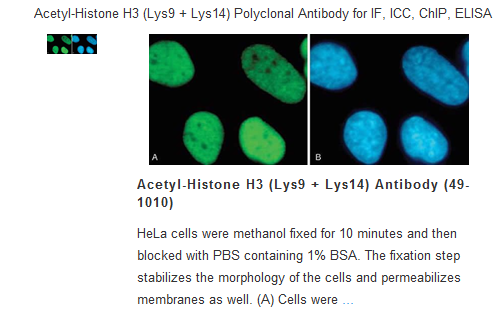 Raised against the region of the histone H3 containing the acetylated lysines 9 and 14 (or [K9/14ac]), using a KLH-conjugated synthetic peptide.