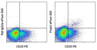 Intracellular staining of human peripheral blood mononuclear cells (PBMCs) with PCH101 antibody using the anti-human Foxp3 Staining Set and protocol reveals approximately 0.5-4% of lymphocytes staining, with the majority of staining occurring in the CD25bright population. This is subject to donor variability.