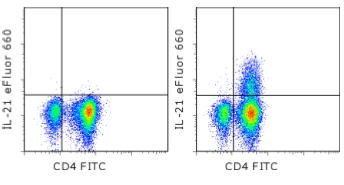 Description: The monoclonal antibody eBio3A3-N2 reacts with human IL-21, a potent stimulator of NK and cytolytic T cells. IL-21 is a 131 amino acid protein most closely related to IL-2 and IL-15. Expression is found in CD4+ cells upon activation. In addition to its effect on NK cells, IL-21 stimulates proliferation of B-cell stimulated by crosslinking of the CD40 antigen and stimulates the proliferation of bone marrow progenitor cells and the expression of the NK-cell marker CD56 in the presence of IL-15.