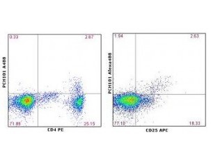 The PCH101 antibody reacts with the amino terminus of human foxp3 protein also known as FORKHEAD BOX P3, SCURFIN, and JM2; cross reactivity of this antibody to other proteins has not been determined. Foxp3, a 49-55 kDa protein, is a member of the forkhead/winged-helix family of transcriptional regulators, and was identified as the gene defective in ‘scurfy’ (sf) mice. Constitutive high expression of Foxp3 mRNA has been shown in CD4+CD25+ regulatory T cells (Treg cells), and ectopic expression of foxp3 in CD4+CD25- cells imparts a Treg phenotype in these cells.