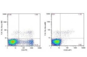 Intracellular staining of mouse splenocytes with FJK-16s using the PE anti-mouse/rat Foxp3 Staining Set and protocol reveals approximately 2% of total cells in the C57Bl/6 strain and approximately 3-5% in the BALB/c mouse strain. Multicolor flow cytometric analysis demonstrates approximately 90% of the CD4+CD25+ cells and 4% of the CD4+CD25- cells staining with FJK-16s. B220+, CD11b+, CD11c+, and Ly6G/Gr-1+ cells do not show significant co-staining with FJK-16s.