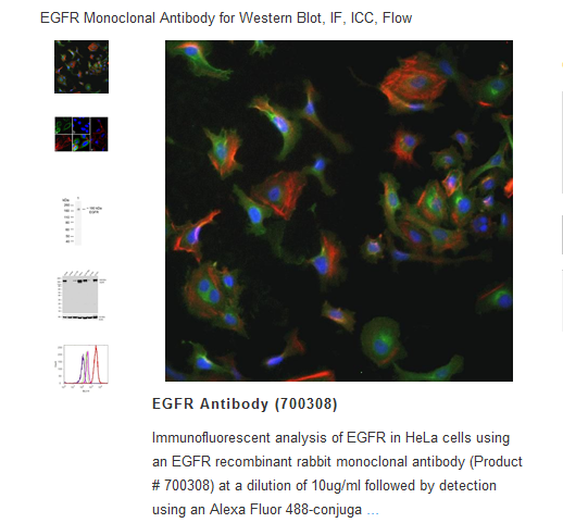 Epidermal Growth Factor Receptor (EGFR) is a 175 kDa transmembrane glycoprotein belonging to tyrosine kinase superfamily. It acts as a receptor for epidermal growth factor (EGF) family proteins. Binding of EGFR to its ligands causes autophosphorylation of tyrosine kinase followed by activation of signal transduction pathways connected to cell proliferation and differentiation. Tyrosine 1068 present within the cytoplasmic domain of the receptor is a major autophosphorylation site that allows binding of Grb2 and activation of the Ras-Raf-ERK1 and ERK2 signaling pathway.