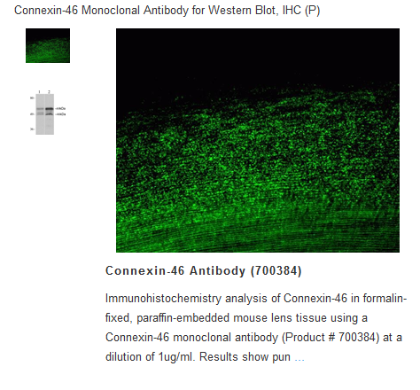 Connexin 46 (Cx46), also known as Gap Junction Protein Alpha-3 (GJA3), CAE3, CX46 and C2P3, maps to human chromosome 13q11-q12 and encodes a 46 kDa protein. Cx46, along with Cx50, is principally expressed in the lens of the eye. Cx46 mediates intercellular interactions during development and is necessary for the survival of neural crest cells. Cx46 forms gap junctions that connect lens fiber cells and are crucial for maintaining lens transparency and normal lens function. Mutations of Cx46 result in severe cataracts of the lens. Individual knockouts of Cx46 and Cx50 lead to changes in the rate of lens fiber cell differentiation and cell size, thus the interaction of Cx46 and Cx50 is required for proper organization of fiber cells.