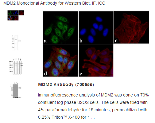 70-0555 has been successfully used in immunofluorescence and western blot. In western blot applications, 70-0555 recognizes the ~55kD and ~75kD isoforms of MDM2.
