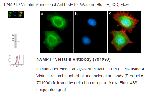 Visfatin, also known as pre-B cell colony-enhancing factor, is an adipocytokine that is abundantly secreted by visceral adipose tissue, with insulin mimetic effects. Visfatin mimics insulin signaling by binding to the insulin receptor and reducing glucose release from liver cells, while stimulating glucose utilization in adipocytes and myocytes. Visfatin is also invoved in enhancement of cell proliferation, biosynthesis of nicotinamide mono-and dinucleotide and glucose homeostasis.
