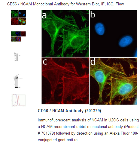The neural cell adhesion molecule (NCAM) is a member of the Ig superfamily, and is involved in mediating homophilic binding. A number of different isoforms of NCAM exist. The isoforms are differentially expressed depending upon tissue type, and stage of development. In addition to playing a role in cell-cell adhesion, NCAM is also involved in development, neurite outgrowth, synaptic plasticity, learning, and memory.