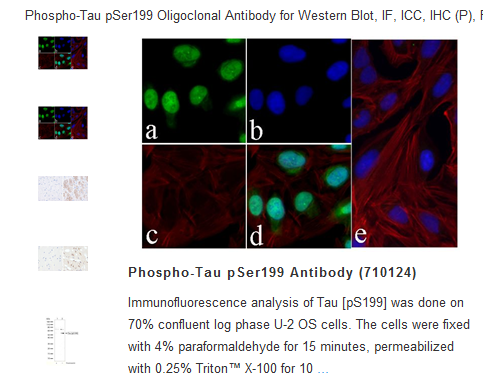 Tau protein plays a very important role in nucleation and stabilization of microtubules by associating with tubulin subunits. In humans, Tau is predominantly expressed in the brain, and is involved in neurodegeneration when the protein is misfolded, hyperphosphorylated, or self-assembles into tangles. Six isoforms of Tau with varying degree of affinity to tubulin exist. Numerous serine/threonine kinases, including GSK-3 beta, protein kinase A, and casein kinase II (CK2) phosphorylate Tau. Phosphorylation of the serine 396 residue is triggered through GSK-3beta and cdk5. The gene encoding the Tau protein consists of 16 exons, and is located at chromosomal locus 17q21.