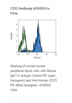 CD33 is found on granulocyte and macrophage precursors in the bone marrow, but is not on pluripotent stem cells. The protein is also expressed on, and is a useful marker for, peripheral monocytes. It is also useful for distinguishing myelogenous leukaemia cells from lymphoid or erythroid leukaemias.