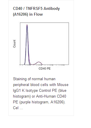The CD40 antigen is a single chain glycoprotein. It is known to be a member of the tumor necrosis factor / nerve growth factor superfamily and shows a significant homology to the Hodgkin's disease associated antigen, CD30. CD40 is present on all B cells except plasma cells. It is also found on some epithelial cells, carcinomas and lymphoid dendritic cells. The precise function of the CD40 antigen is unknown but it appears to be involved in the transduction of regulatory signals for cellular functions such as B cell proliferation and differentiation.