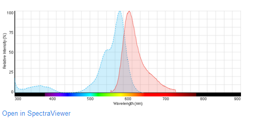 • With an excitation and emission maximum of 577/603 nm, Alexa Fluor® 568 can be efficiently excited using a 568 nm Kr laser line and detected under standard Rhodamine Red/Cy3.5® filters
