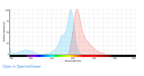 The Alexa Fluor® 594 Monoclonal Antibody Labeling Kit provides a convenient means to label small amounts of monoclonal antibodies with the superior Alexa Fluor® 594 dye. Monoclonal antibodies are often available only in small quantities and this kit is optimized for labeling 100 µg per reaction. Comparably small amounts of polyclonal antibodies or other proteins (>30 kDa) can also be labeled. For labeling larger amounts of proteins (~1 mg), we recommend our Alexa Fluor® 594 Protein Labeling Kit (A10239). Alexa Fluor® 594 conjugates are more fluorescent than Texas Red® conjugates and exhibit high photostability.